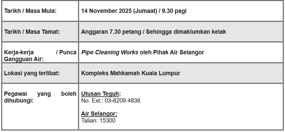 Kindly note that the water supply at KMKL will be disrupted today, 14 November 2025, from 9:30am until 7:30pm.